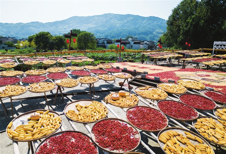 地处皖南山区的安徽省黄山市徽州区呈坎古村自古都有晒秋习俗。近年来,晒秋时节,该村村民会将农作物在村中广场集中晾晒,构成一幅五谷丰登的秋收画卷,吸引不少游客前往观赏,成为当地秋日里的旅游特色。