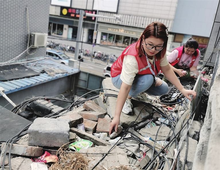 针对这一情况,9月13日,网格员郭静、赵迪对平台的垃圾进行清理。清理过程中,两人在保证安全的情况下,徒手将垃圾一件件捡出,再将捡出的垃圾和杂物进行集中清理。经过一上午的忙碌,两人终于将平台清理干净。路过的居民看到这一幕,纷纷为两人点赞。