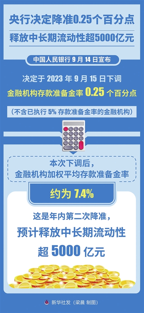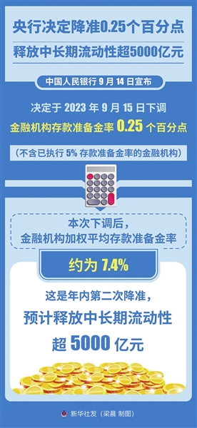 中国人民银行当日宣布,决定于2023年9月15日下调金融机构存款准备金率0.25个百分点(不含已执行5%存款准备金率的金融机构)。这是年内第二次降准,今年首次降准已于3月落地,两次降准共降低金融机构存款准备金率0.5个百分点、释放长期资金超万亿元。本次下调后,金融机构加权平均存款准备金率约为7.4%。