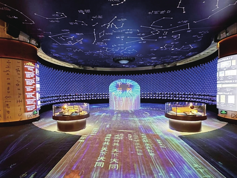 ——更沉浸。走进展厅,头顶上方是古天文图、古丝绸之路地图,脚下则是流淌着一行行经典语录的“中华文明之河”和“民族走廊”。