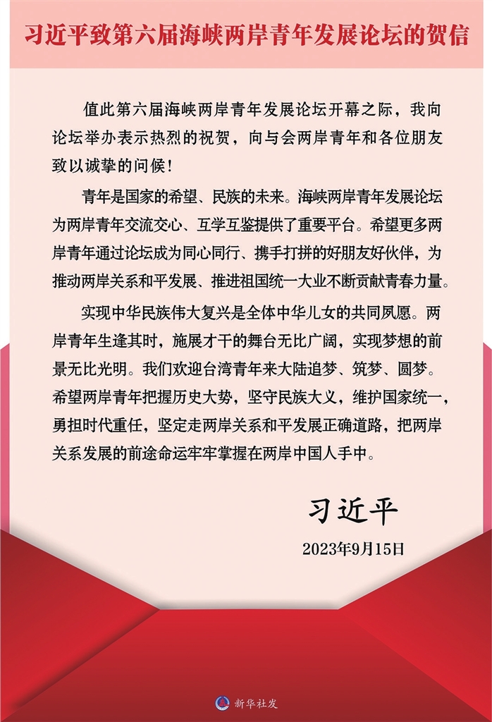 习近平指出,青年是国家的希望、民族的未来。海峡两岸青年发展论坛为两岸青年交流交心、互学互鉴提供了重要平台。希望更多两岸青年通过论坛成为同心同行、携手打拼的好朋友好伙伴,为推动两岸关系和平发展、推进祖国统一大业不断贡献青春力量。