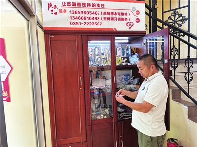 很多人遇到过类似情况,家里水管突然破裂,或者灯泡突然坏了,尤其冬季开始供暖,暖气片漏水也较常见。白天好说,很容易买到替换的配件,晚上就不方便。在海唐居业100城小区,和泽苑社区与小区业主共同成立了物业管理委员会,得知大家的需求后,在A座居民楼一层大厅设置了工具柜,里面配有水龙头、水管阀门、开关插座、灯泡等,还有防水胶布、膨胀螺丝等工具。如此一来,居民家里的水电气暖有了突发状况,下楼就能找到相应的工具和配件,有利于事情及时得到解决。
