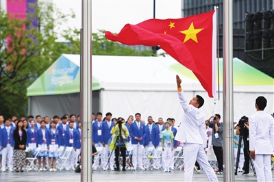 这是9月16日拍摄的中国体育代表团升旗仪式。