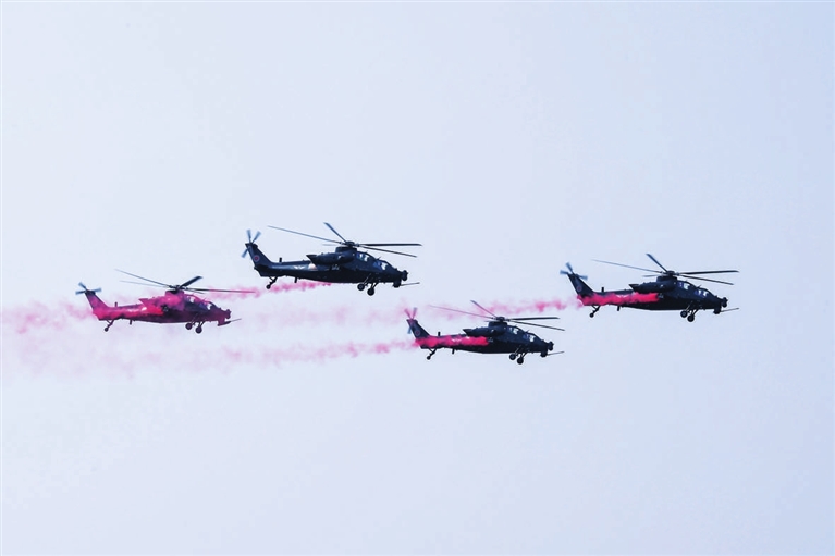 “四机同时拉起!疾速上升!到达顶点!开花!”四架直-10武装直升机飞行轨迹犹如一朵鲜花在空中绽放,现场观众一阵欢呼。