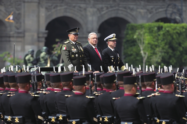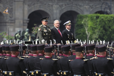 9月16日,墨西哥总统洛佩斯(中)在墨西哥首都墨西哥城出席独立日阅兵式。