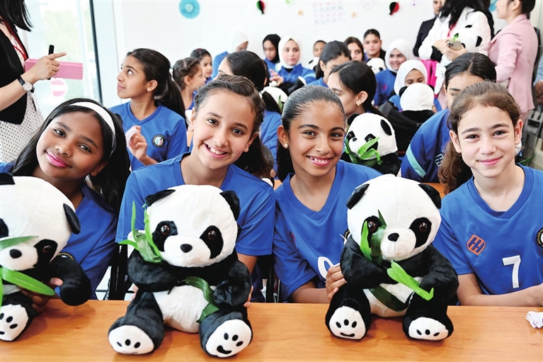 9月17日,在科威特哈瓦利省的科威特中国文化中心,体验学习汉语的孩子们与熊猫玩具合影。