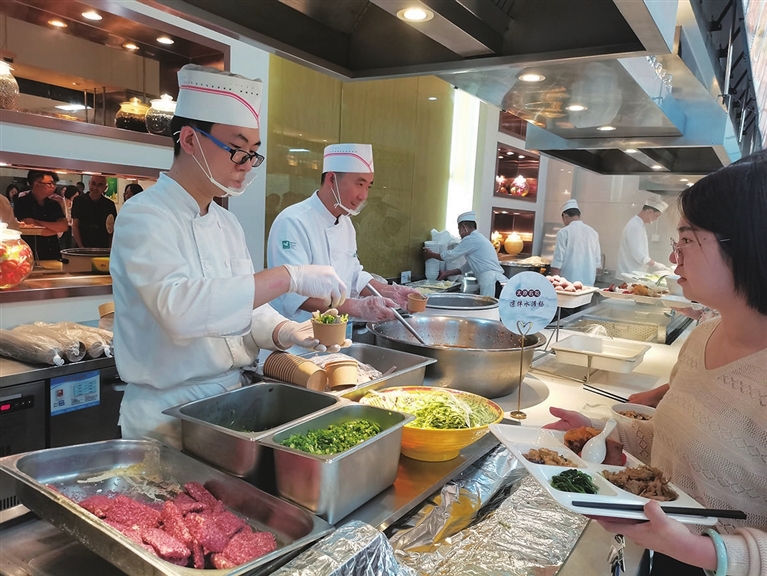 9月19日中午,滨河西路集中办公区内特色菜品琳琅满目,包括老太原丸子汤、阳曲红枣发糕、晋源凉拌水灌肠、老太原过油肉、尖草坪打卤面等,受到就餐人员好评。“热乎乎的一碗手擀面,浇上一勺卤汁,甭提多香了。面里加点醋和辣椒,轻松吃两碗没问题。”前来就餐的刘师傅对尖草坪打卤面味道赞不绝口。
