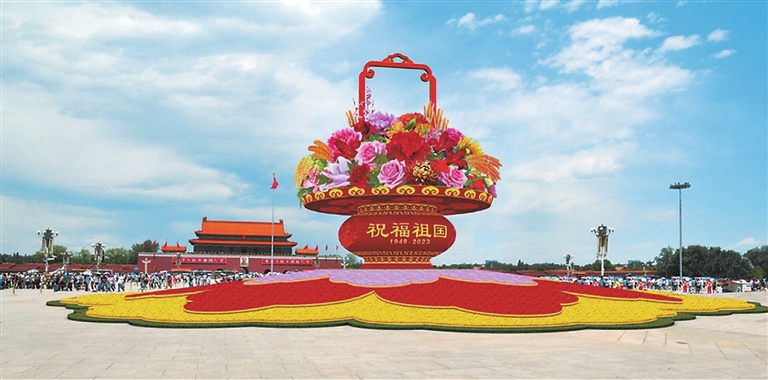 北京市园林绿化局城镇绿化处处长刘明星介绍,今年,国庆天安门广场和长安街沿线花卉布置方案的主题为“中国式现代化全面推进中华民族伟大复兴”。