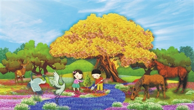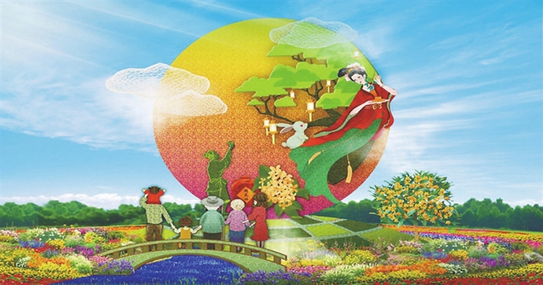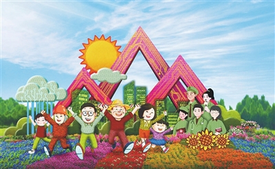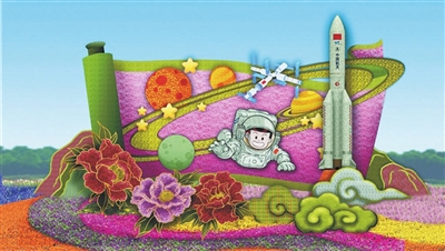 这10处花篮中的形象,既有国家版本馆、三北防护林,也有航天员、中欧班列,还有胡同人家放风筝的少年和果实累累的柿树。