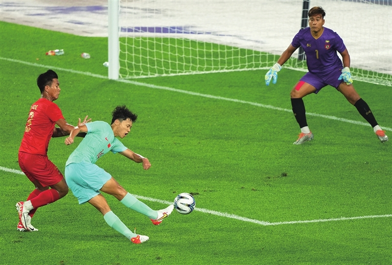 9月21日晚的小组赛第二轮中,凭借谭龙、王振澳和戴伟浚的进球,4比0轻松击败缅甸队。拿下两连胜后,中国队提前锁定小组第一,晋级亚运会十六强。