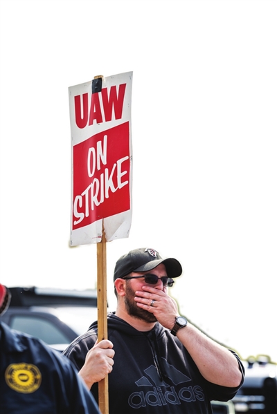 9月22日,在美国密歇根州贝尔维尔通用汽车部件厂外,车企工人高举罢工标语。 新华社 发