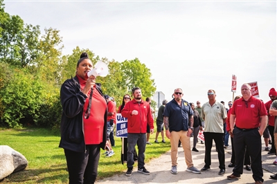 9月22日,在美国密歇根州贝尔维尔的通用汽车部件厂外,工会地区负责人在罢工游行现场讲话。