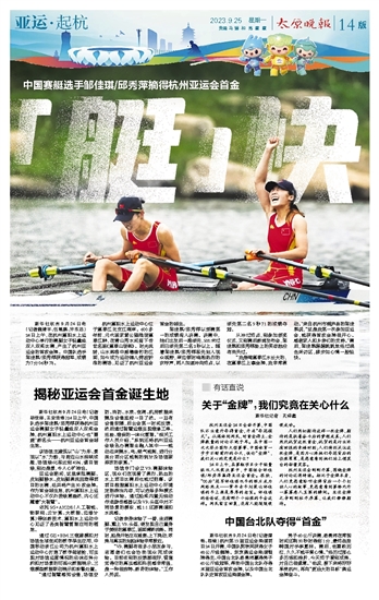 中国赛艇选手邹佳琪/邱秀萍摘得杭州亚运会首金