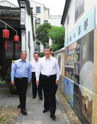 总书记步行察看村容村貌,眼前一座座黛瓦白墙的小楼,房前屋后点缀着绿树花草,白墙上一幅幅壁画描绘着乡愁记忆和对美好未来的憧憬,透出美丽乡村的勃勃生机。