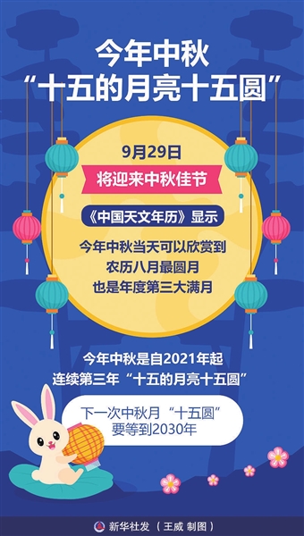 “以中秋月圆为例,2000年到2099年的100年间,有48次中秋月是‘十六圆’,37次‘十五圆’,15次‘十七圆’,这一期间没有‘十四圆’。今年中秋是自2021年起,连续第三年‘十五的月亮十五圆’。下一次中秋月‘十五圆’要等到2030年。”王科超说。