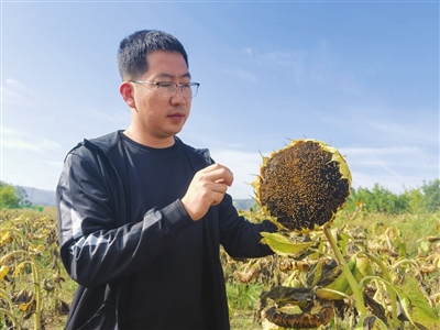 金秋时分,阳光灿烂,天高云淡。九润现代农业观光园的葵花地里,沉甸甸的葵盘面向大地,一颗颗黑色的葵花籽紧致浓密。“20多天前,这里还是一片葵海,很是壮观,市民纷纷前来打卡拍照。我们马上要举办葵王采摘大赛,让大家共同感受丰收的乐趣。”技术员薛晓锋举起一个葵盘,从上面摘下小小的葵花籽。“这是油葵,夏天可赏花,结籽可榨油,经济价值很高。”凡来赏花的市民都少不了走入这里的智能温室,感受一番现代化种植的壮观场面。