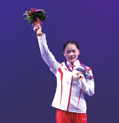 10月2日,在女子蹦床个人决赛中,胡译乘以55.790分获得一枚银牌,她的队友朱雪莹以56.720分夺冠。