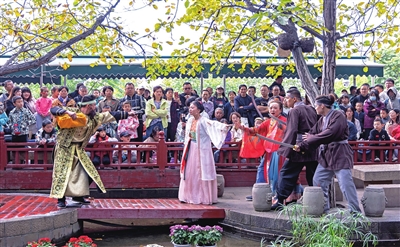10月3日,在太山风景区,游客们在观看实景剧《地宫蝶恋》。国庆期间,太山博物馆举办“优秀传统文化月”系列活动,推出实景剧、菊花展、汉服体验等项目,让旅客畅游赏太山美景,感受文化魅力。 张昊宇 摄