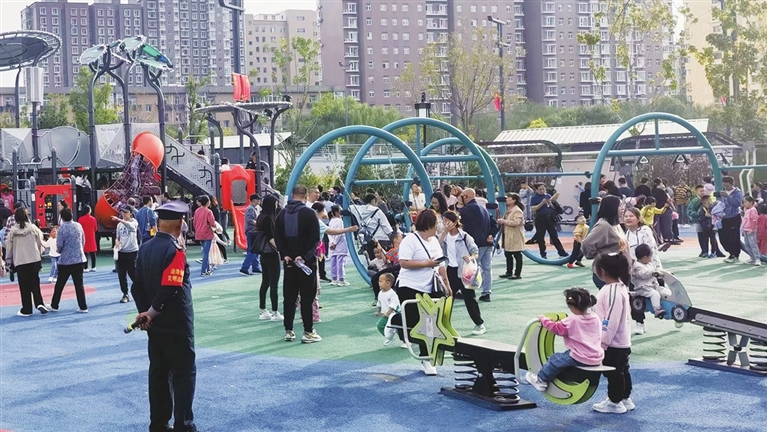 两节期间,我市各公园儿童活动区成为孩子们户外运动的首选。图为10月4日,家长带着孩子来到迎泽公园儿童活动区,滑滑梯、荡秋千,享受假日悠闲时光。 于健 摄