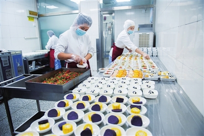 冷荤间,几名师傅动作麻利地将哈密瓜、西瓜、火龙果等水果切块,搭配曲奇饼干、紫薯蛋糕,一份份装盒、封膜。量不大,却很精致。师傅说,航空公司的订餐标准各不相同,每天从太原机场出港至少30家航空公司,光菜谱就准备了十余种。经济舱、头等舱也有区别,所以乘客吃到的餐食不完全一样。离送上飞机还有一段时间,为防止变质,配制好的成本餐食将被送入0℃至5℃的冷藏室存放。