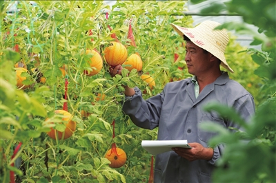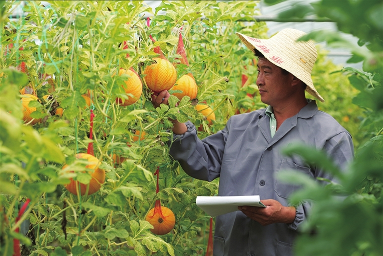技术人员在河北省石家庄市新华区一家种业基地查看瓜果成熟情况。