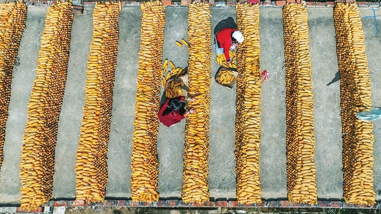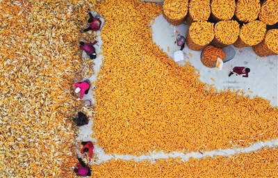河北省遵化市刘备寨乡农民在码放晾晒收获的玉米。