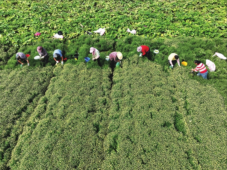 在江苏省盐城市大丰区三龙镇东红村,村民采摘菊花。