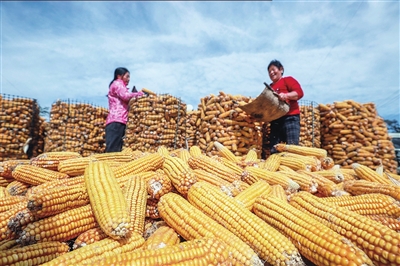 河北省邯郸市广平县广平镇南庄村的农民将玉米装袋,准备晾晒。