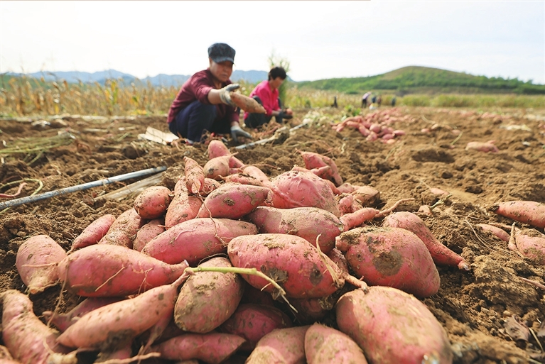 河北省唐山市迁西县新庄子镇向阳村农民在收获山地红薯。 本版图片新华社发