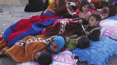 10月7日,在阿富汗赫拉特省,受灾民众躺在地上休息。
