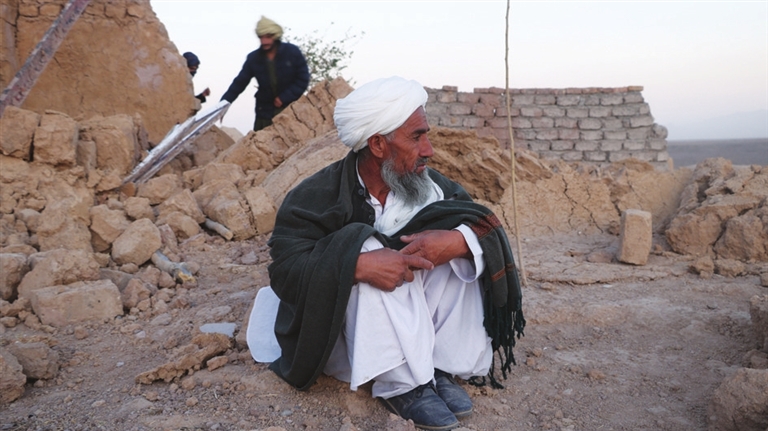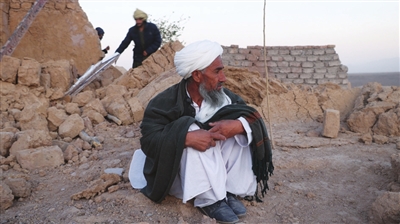 10月7日,在阿富汗赫拉特省,一名老人坐在自家坍塌的房屋前。新华社 发