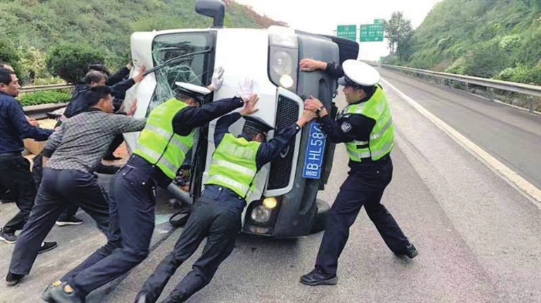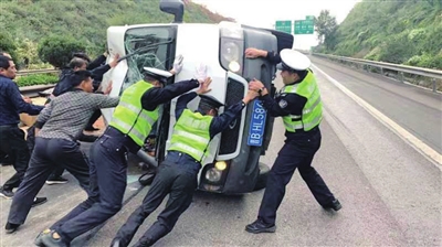 10月6日早8时许,高速交警一支队四大队接到报警称,绕城高速85公里处,一辆面包车发生单方事故,车辆侧翻。接警后,民警很快赶到现场,将驾驶人和乘客救出。此时,是长假最后一天,交通高峰很快就要到来,如不快速清理现场,极易引发拥堵和二次事故,而救援车辆赶来,最少需要半个小时。情况紧急,民警和高速综合执法队员决定徒手施救,大家合力将面包车扶正,推到应急车道,快速恢复交通。