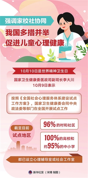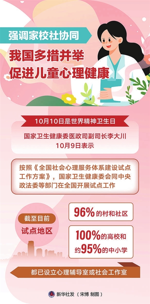 印发《关于加强心理健康服务的指导意见》,就做好儿童青少年心理健康工作作出明确部署;中央财政安排专项资金,支持常见精神障碍疾病防治和儿童青少年心理健康促进试点项目;《全面加强和改进新时代学生心理健康工作专项行动计划(2023—2025年)》明确各级政府部门工作职责,将学生心理健康工作纳入省级人民政府履行教育职责评价……据介绍,国家卫生健康委近年来会同有关部门开展了一系列工作,促进儿童心理健康。