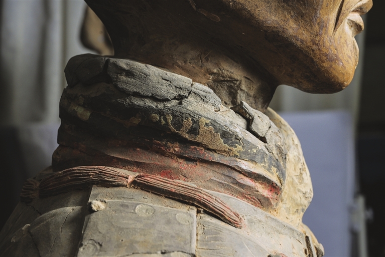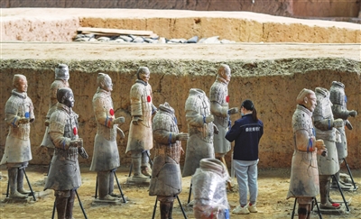 据秦始皇帝陵博物院文物修复专家兰德省介绍,每一件带有彩绘的兵马俑一经出土,就要经过X光射线探伤、超声波检测、三维图像采集等程序,之后还要经过现状记录、清理、加固、拼对粘接、补全,然后绘图、建立保护修复档案、留观等步骤,最后归还考古及藏品管理部门,成为一位带有“身份证号”的彩绘秦俑战士。