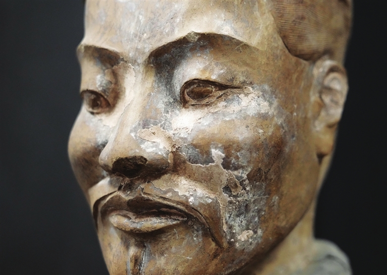 考古显示,兵马俑的服饰上有朱红、粉绿、紫、蓝、赭等十几种颜色。埋在地下两千余年的彩绘秦俑经过火烧水淹,其彩绘层十分脆弱。出土后,随着湿度和温度发生变化,表面很快失水,漆面迅速卷曲剥落。除此之外,微生物、可溶盐等因素也是引发秦俑褪色的重要原因。“彩绘兵马俑的保护修复工作,就像医院给病人看病,我们是兵马俑的专科医生,这间屋子就是博物院里的‘文物医院’。”兰德省说。