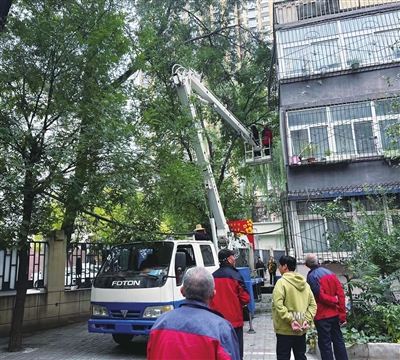 摸清情况后,社区和园林部门取得联系。10月6日,园林部门派工程车来到小区内,对树木进行全面彻底修剪。此前,社区干部、网格员在线上线下发出通知,挨个打电话告知车主挪车,给园林工程车让出通道。修剪开始后,社区干部、网格员们一边维持现场秩序,一边和园林部门现场指挥人员密切沟通,对枝干掉落、树木倒伏、枝叶触碰高压线等突发情况随时采取紧急措施。