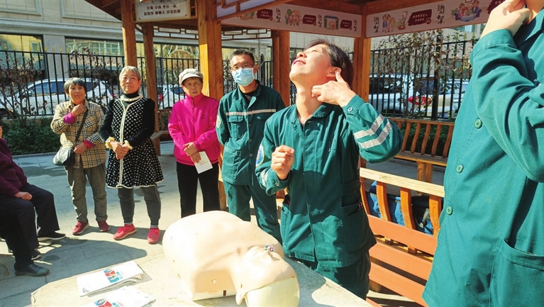 10月10日上午,太原市急救中心北站救护人员走进滨东社区内燃机宿舍,面对面给居民们讲解示范人体各部位受伤后的自救、互救方法,传授了基本的应急护理技能。 韩睿 冀琦 摄