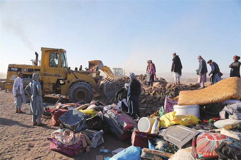 记者在奈卜拉菲村通往赫拉特市的路上看到,一辆辆满载救援物资的车辆行驶在狭窄的土路上,对面的车辆自发为前往灾区的卡车和增援的挖掘机让路。