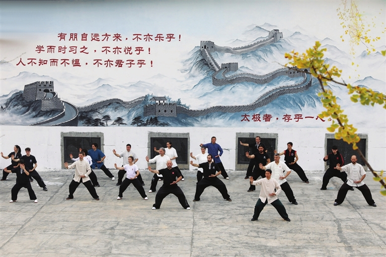 10月10日,在太极拳发源地河南省焦作市温县陈家沟,“洋弟子”在拳师的带领下习练太极拳。当日,来自智利、巴西、阿根廷等国的多名“洋弟子”在陈家沟国际太极院练习太极拳、太极推手以及陈家沟舞虎。 新华社 发