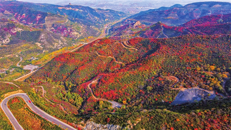 漫山的深红、浅红、橘红、金红……在阳光的照耀下,诗意,霎时就浸染了千山万壑。