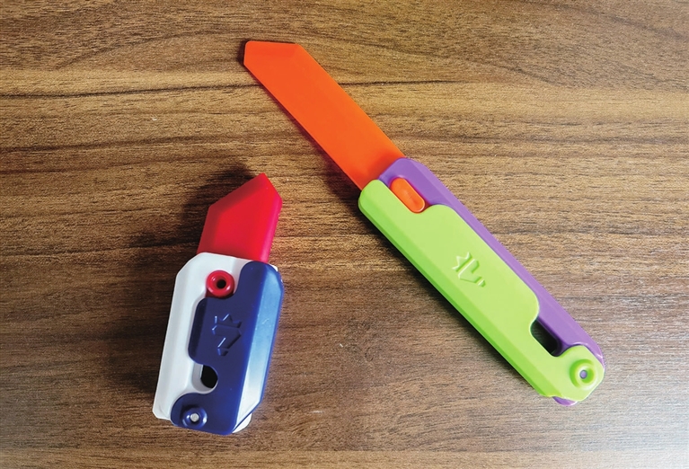 “阿姨,有萝卜刀吗?”“当然有!好几个款式呢!都是10元。”10月7日上午,在食品街一家店铺内,跟父母一起逛街的10岁男孩鹏鹏在店里买到了自己心心念念的“萝卜刀”。他随后兴高采烈地开始不断甩刀对着空气做出各种“戳”“砍”的动作,玩得不亦乐乎。店主蔡女士告诉记者,“萝卜刀”其实就是一款彩色塑料仿刀玩具,由于形状类似萝卜而得名。“萝卜刀”有多种玩法,基本的玩法就是将小刀垂下后收回;第二种玩法是通过手指打开一个小缝,然后快速甩出刀;第三种玩法是将刀倒过来,打开一条小缝后迅速捏紧,然后等待刀落回手中;第四种玩法是将出鞘的刀收回手掌中。