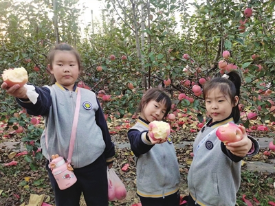 带着一头汗、一身土,孩子们又来到果园。诱人的红富士苹果像红灯笼一样挂满了枝头,孩子们走走停停,一边欣赏,一边采摘。咬一口亲手摘的苹果,味道甜滋滋的,有的学生说:“比爸爸妈妈在菜市场买的要好吃得多。”还有的学生看着自己的劳动成果,自言自语说:“妈妈如果知道这是我摘的,一定很吃惊!”