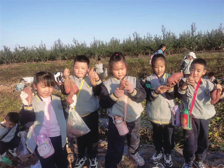 在行走的课堂中,挖红薯是孩子们的第一项任务,结合之前老师发放的任务卡,他们已经了解了红薯的形态、生长方式及环境,对这种根茎类作物是如何在地里生长的充满了好奇。来到红薯地,看着光秃秃的土地,他们感到疑惑:“红薯在哪?”别着急,手拿小铲子,跟着农民伯伯仔细观察,顺着地里伸出的根儿去挖,定会有收获。孩子们是有耐心的,他们慢慢寻找,专注去挖,果然挖到了越来越多的红薯,有的挖出了“三胞胎”,有的挖出了“五胞胎”,大家兴奋不已。不知道谁说了一句:“咱们比一比谁挖的红薯最大!”大家的干劲更足了。眼看别人都挖到了红薯,一年三班的一名学生并不着急,只见他埋头正在攻克“难题”,一个超大的红薯已经露出一半的身躯,几个眼尖的孩子看到后,围拢过来一起帮忙,不一会儿,“红薯王”就正式亮相了,孩子们相视一笑,脸上露出满足的笑容。