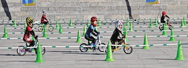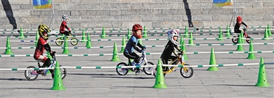 在专业车手与大众巡游活动启程的同时,一场儿童滑步车比赛也在五一广场揭开战幕。2岁至10岁的小朋友们,蹬上自己的爱车,在绕圈赛中大展身手。