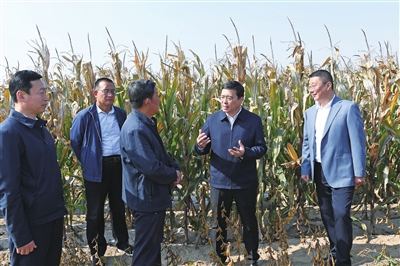 省委常委、市委书记韦韬在阳曲县高村乡马坡村调研大豆玉米复合种植示范基地秋收情况。 梁琛 摄
