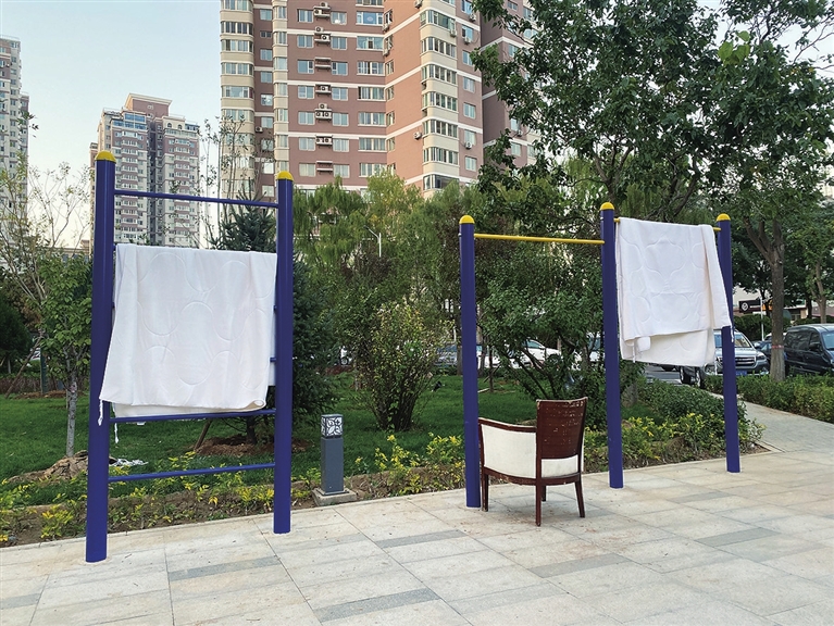 10月15日,望景路滨河花苑小区,有居民将床单晾晒在健身器材上。最近,该小区改造一新,安装了不少健身器材,为居民日常活动提供了方便。一位居民建议:“小区改造得这么美,希望大家都来爱护,不要随意占用公共资源晾晒个人物品。”