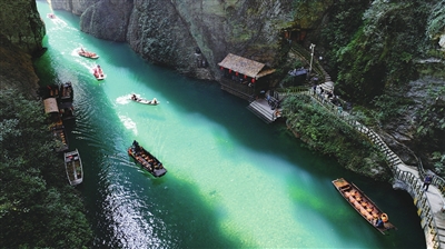 秋日,湖北省恩施土家族苗族自治州鹤峰县容美镇屏山村屏山旅游景区吸引众多游客。屏山旅游景区河水清澈见底,舟行水上如悬浮空中,美如画卷。