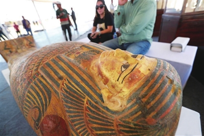 这是10月15日在埃及明亚省考古现场拍摄的彩绘木乃伊棺椁。 新华社 发