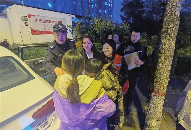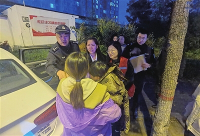 天越来越黑,雨下个不停,幼小的孩子不能一直在外面冻着,两人紧紧抱着孩子,不知该去哪儿躲躲。这时,旁边一位临时停车的车主看见她们,赶紧打开车门和暖风让三个人上车取暖。不多时,社区范主任赶到现场,表示已经通知所有社区人员在辖区各居民群转发走失孩子的消息,发动大家一起寻找家长,并给孩子拿来适合的棉服穿上。随后,民警赶到现场,一起帮忙查找。
