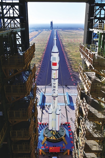 10月19日,神舟十七号载人飞船与长征二号F遥十七运载火箭组合体准备转运。 新华社 发